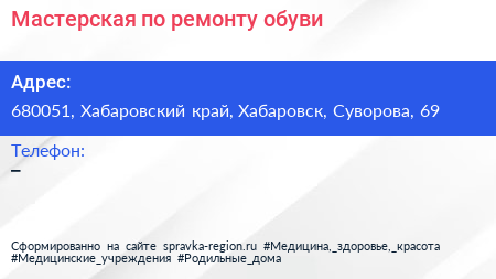Мастерская по ремонту обуви по адресу 680051, Хабаровский край, Хабаровск, Суворова, 69 в дальнейшем Организация, размещена в следующих категориях: