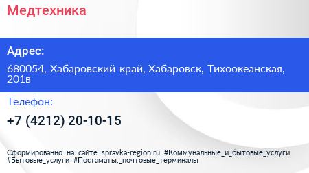 Медтехника по адресу 680054, Хабаровский край, Хабаровск, Тихоокеанская, 201в в дальнейшем Организация, размещена в следующих категориях:
