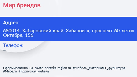 Мир брендов по адресу 680014, Хабаровский край, Хабаровск, проспект 60-летия Октября, 156 в дальнейшем Организация, размещена в следующих категориях: