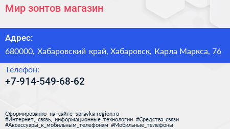 Мир зонтов, магазин по адресу 680000, Хабаровский край, Хабаровск, Карла Маркса, 76 в дальнейшем Организация, размещена в следующих категориях: