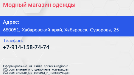 Модный, магазин одежды по адресу 680051, Хабаровский край, Хабаровск, Суворова, 25 в дальнейшем Организация, размещена в следующих категориях: