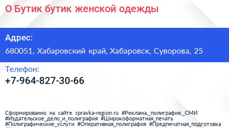О`Бутик, бутик женской одежды по адресу 680051, Хабаровский край, Хабаровск, Суворова, 25 в дальнейшем Организация, размещена в следующих категориях: