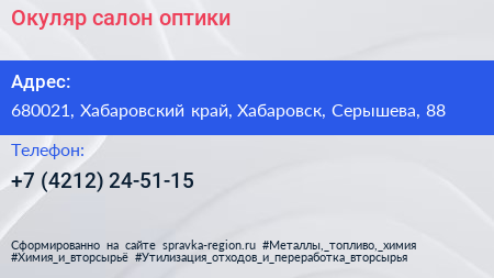 Окуляр, салон оптики по адресу 680021, Хабаровский край, Хабаровск, Серышева, 88 в дальнейшем Организация, размещена в следующих категориях:
