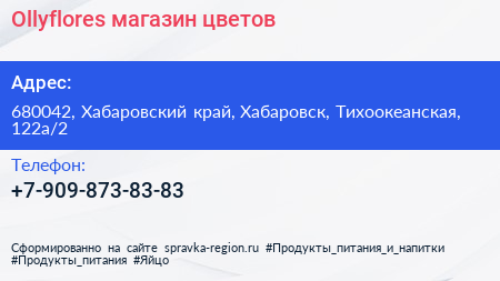 Ollyflores, магазин цветов по адресу 680042, Хабаровский край, Хабаровск, Тихоокеанская, 122а/2 в дальнейшем Организация, размещена в следующих категориях: