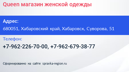 Queen, магазин женской одежды по адресу 680051, Хабаровский край, Хабаровск, Суворова, 51 в дальнейшем Организация, размещена в следующих категориях: