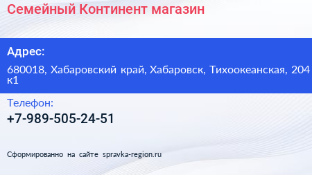 Семейный Континент, магазин по адресу 680018, Хабаровский край, Хабаровск, Тихоокеанская, 204 к1 в дальнейшем Организация, размещена в следующих категориях:
