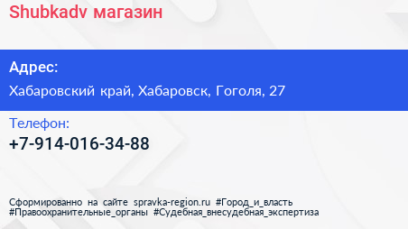 Shubkadv, магазин по адресу Хабаровский край, Хабаровск, Гоголя, 27 в дальнейшем Организация, размещена в следующих категориях: