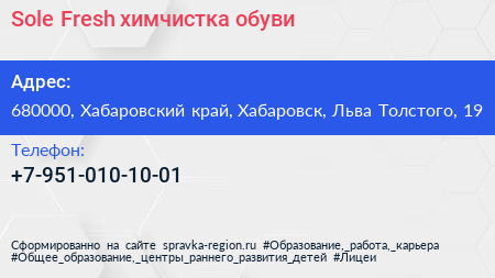 Sole Fresh, химчистка обуви по адресу 680000, Хабаровский край, Хабаровск, Льва Толстого, 19 в дальнейшем Организация, размещена в следующих категориях: