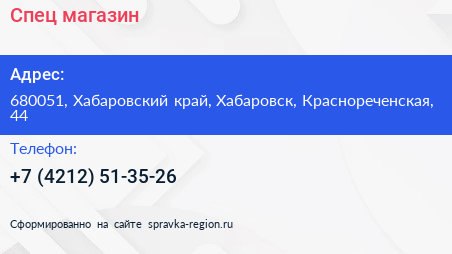 Спец, магазин по адресу 680051, Хабаровский край, Хабаровск, Краснореченская, 44 в дальнейшем Организация, размещена в следующих категориях: