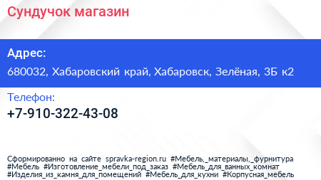 Сундучок, магазин по адресу 680032, Хабаровский край, Хабаровск, Зелёная, 3Б к2 в дальнейшем Организация, размещена в следующих категориях: