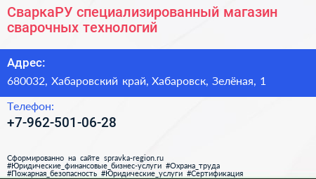 СваркаРУ, специализированный магазин сварочных технологий по адресу 680032, Хабаровский край, Хабаровск, Зелёная, 1 в дальнейшем Организация, размещена в следующих категориях: