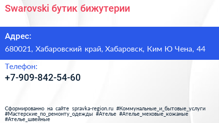 Swarovski, бутик бижутерии по адресу 680021, Хабаровский край, Хабаровск, Ким Ю Чена, 44 в дальнейшем Организация, размещена в следующих категориях: