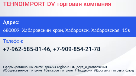 TEHNOIMPORT DV, торговая компания по адресу 680009, Хабаровский край, Хабаровск, Хабаровская, 15в в дальнейшем Организация, размещена в следующих категориях: