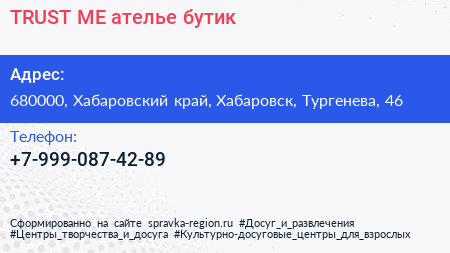 TRUST ME, ателье-бутик по адресу 680000, Хабаровский край, Хабаровск, Тургенева, 46 в дальнейшем Организация, размещена в следующих категориях: