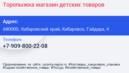 Торопыжка, магазин детских товаров по адресу 680000, Хабаровский край, Хабаровск, Гайдара, 4 в дальнейшем Организация, размещена в следующих категориях: