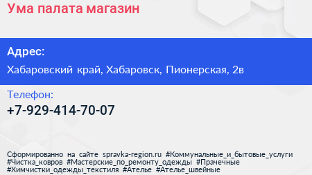 Ума палата, магазин по адресу Хабаровский край, Хабаровск, Пионерская, 2в в дальнейшем Организация, размещена в следующих категориях: