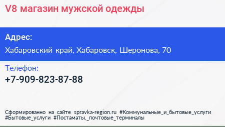 V8, магазин мужской одежды по адресу Хабаровский край, Хабаровск, Шеронова, 70 в дальнейшем Организация, размещена в следующих категориях: