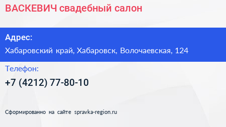 ВАСКЕВИЧ, свадебный салон по адресу Хабаровский край, Хабаровск, Волочаевская, 124 в дальнейшем Организация, размещена в следующих категориях: