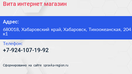 Вита, интернет-магазин по адресу 680018, Хабаровский край, Хабаровск, Тихоокеанская, 204 к1 в дальнейшем Организация, размещена в следующих категориях: