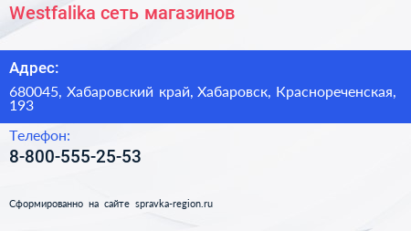 Westfalika, сеть магазинов по адресу 680045, Хабаровский край, Хабаровск, Краснореченская, 193 в дальнейшем Организация, размещена в следующих категориях:
