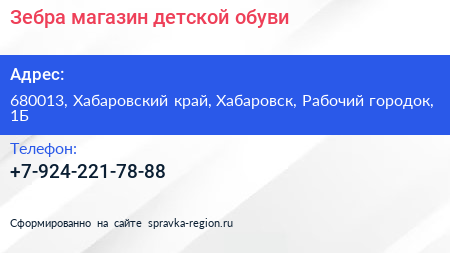Зебра, магазин детской обуви по адресу 680013, Хабаровский край, Хабаровск, Рабочий городок, 1Б в дальнейшем Организация, размещена в следующих категориях: