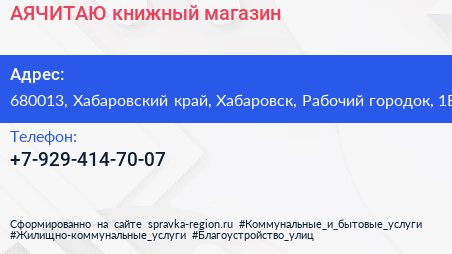 АЯЧИТАЮ, книжный магазин по адресу 680013, Хабаровский край, Хабаровск, Рабочий городок, 1Б в дальнейшем Организация, размещена в следующих категориях: