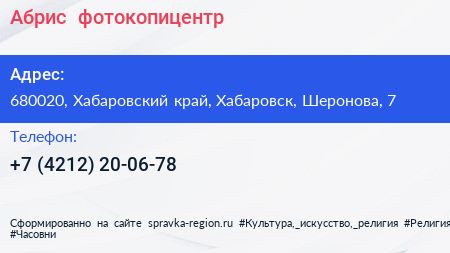 Абрис+, фотокопицентр по адресу 680020, Хабаровский край, Хабаровск, Шеронова, 7 в дальнейшем Организация, размещена в следующих категориях: