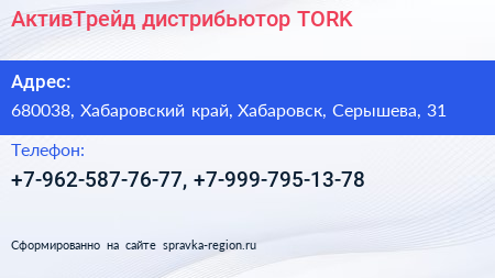 АктивТрейд, дистрибьютор TORK по адресу 680038, Хабаровский край, Хабаровск, Серышева, 31 в дальнейшем Организация, размещена в следующих категориях:
