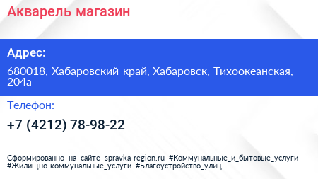 Акварель, магазин по адресу 680018, Хабаровский край, Хабаровск, Тихоокеанская, 204а в дальнейшем Организация, размещена в следующих категориях: