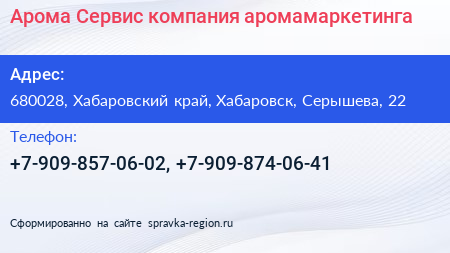 Арома-Сервис, компания аромамаркетинга по адресу 680028, Хабаровский край, Хабаровск, Серышева, 22 в дальнейшем Организация, размещена в следующих категориях: