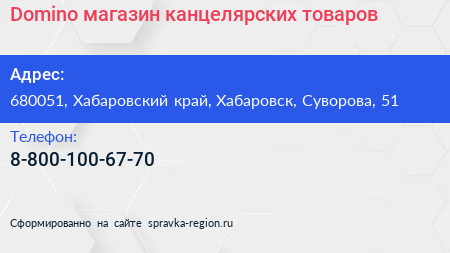 Domino, магазин канцелярских товаров по адресу 680051, Хабаровский край, Хабаровск, Суворова, 51 в дальнейшем Организация, размещена в следующих категориях: