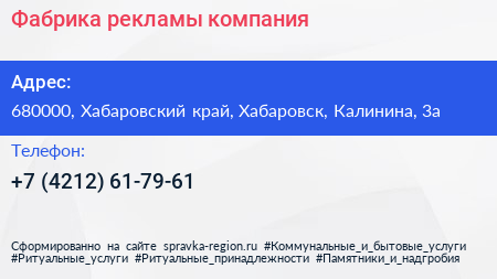 Фабрика рекламы, компания по адресу 680000, Хабаровский край, Хабаровск, Калинина, 3а в дальнейшем Организация, размещена в следующих категориях: