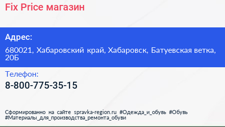Fix Price, магазин по адресу 680021, Хабаровский край, Хабаровск, Батуевская ветка, 20Б в дальнейшем Организация, размещена в следующих категориях: