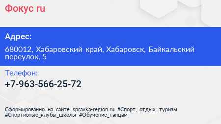 Фокус.ru по адресу 680012, Хабаровский край, Хабаровск, Байкальский переулок, 5 в дальнейшем Организация, размещена в следующих категориях: