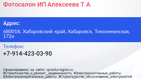 Фотосалон, ИП Алексеева Т.А. по адресу 680018, Хабаровский край, Хабаровск, Тихоокеанская, 172а в дальнейшем Организация, размещена в следующих категориях: