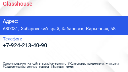 Glasshouse по адресу 680031, Хабаровский край, Хабаровск, Карьерная, 58 в дальнейшем Организация, размещена в следующих категориях: