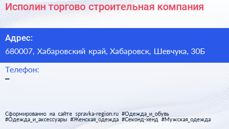 Исполин, торгово-строительная компания по адресу 680007, Хабаровский край, Хабаровск, Шевчука, 30Б в дальнейшем Организация, размещена в следующих категориях: