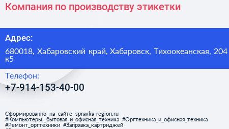 Компания по производству этикетки по адресу 680018, Хабаровский край, Хабаровск, Тихоокеанская, 204 к5 в дальнейшем Организация, размещена в следующих категориях: