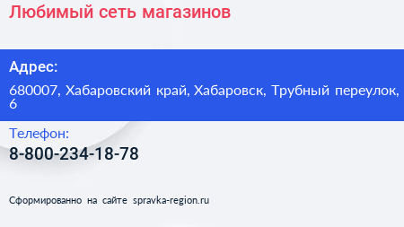 Любимый, сеть магазинов по адресу 680007, Хабаровский край, Хабаровск, Трубный переулок, 6 в дальнейшем Организация, размещена в следующих категориях: