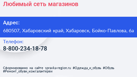 Любимый, сеть магазинов по адресу 680507, Хабаровский край, Хабаровск, Бойко-Павлова, 6а в дальнейшем Организация, размещена в следующих категориях: