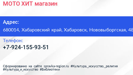 МОТО ХИТ, магазин по адресу 680014, Хабаровский край, Хабаровск, Нововыборгская, 48 в дальнейшем Организация, размещена в следующих категориях: