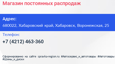 Магазин постоянных распродаж по адресу 680022, Хабаровский край, Хабаровск, Воронежская, 25 в дальнейшем Организация, размещена в следующих категориях: