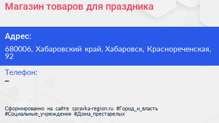 Магазин товаров для праздника по адресу 680006, Хабаровский край, Хабаровск, Краснореченская, 92 в дальнейшем Организация, размещена в следующих категориях: