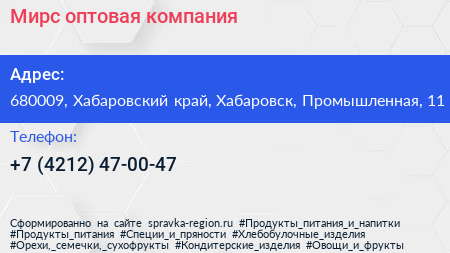 Мирс, оптовая компания по адресу 680009, Хабаровский край, Хабаровск, Промышленная, 11 в дальнейшем Организация, размещена в следующих категориях: