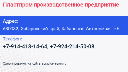 Пластпром, производственное предприятие по адресу 680032, Хабаровский край, Хабаровск, Автономная, 5Б в дальнейшем Организация, размещена в следующих категориях: