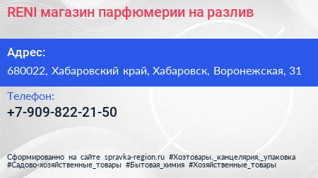 RENI, магазин парфюмерии на разлив по адресу 680022, Хабаровский край, Хабаровск, Воронежская, 31 в дальнейшем Организация, размещена в следующих категориях: