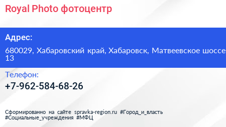 Royal Photo, фотоцентр по адресу 680029, Хабаровский край, Хабаровск, Матвеевское шоссе, 13 в дальнейшем Организация, размещена в следующих категориях: