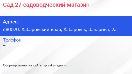 Сад 27, садоводческий магазин по адресу 680020, Хабаровский край, Хабаровск, Запарина, 2а в дальнейшем Организация, размещена в следующих категориях: