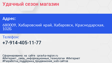 Удачный сезон, магазин по адресу 680009, Хабаровский край, Хабаровск, Краснодарская, 102Б в дальнейшем Организация, размещена в следующих категориях: