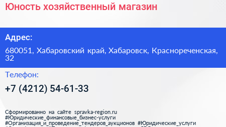 Юность, хозяйственный магазин по адресу 680051, Хабаровский край, Хабаровск, Краснореченская, 32 в дальнейшем Организация, размещена в следующих категориях: